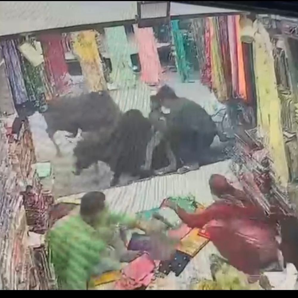 बृज नगर की दुकान में घुसे दो सांड:पिता ने बचाई पांच साल के बच्चे की जान, नगर पालिका प्रशासन के खिलाफ प्रदर्शन