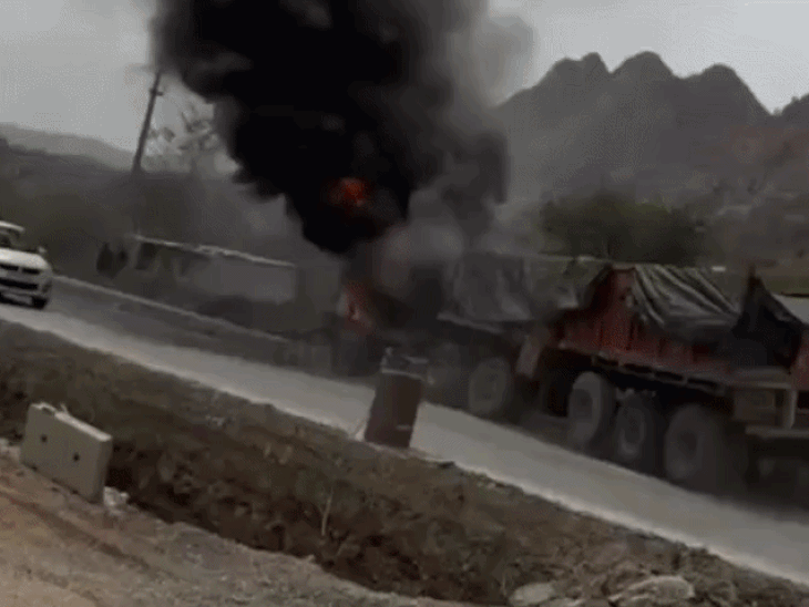 उदयपुर-पिंडवाड़ा हाईवे पर चलते ट्रेलर में लगी आग:डिवाइडर पारकर दूसरी सड़क पर जा घुसा जलता हुआ ट्रक, ड्राइवर ने कूदकर बचाई जान